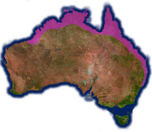It is also found in New Guinea and on the offshore islands including Woodlark Island, Alcester Island, Kiriwina, and Halmahera.