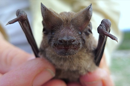 Caught in a net in the Yucatan, just outside the Tzabnah cave near the village of Tecoh. Sadly I don't remember the name of the Sturnira species we were catching. You could easily identify these fruit bats by the dark fur on the shoulder, particularly dark on this individual. This is a member of the Phyllostomids, the leaf-nosed bats -- see the leaf on its nose? They are a very remarkable and diverse group of neotropical bats.